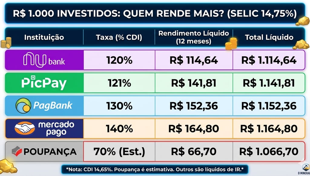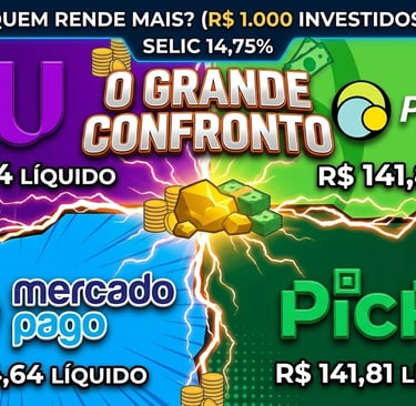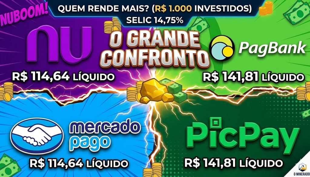 A Selic caiu para 14,75% e o rendimento do Nubank, PicPay, PagBank e Mercado Pago mudou! Rodei o algoritmo 'Garimpo' e descobri qual conta digital rende mais de verdade com R$ 1.000,00. O 1º lugar vai te surpreender. Confira o ranking real e líquido!