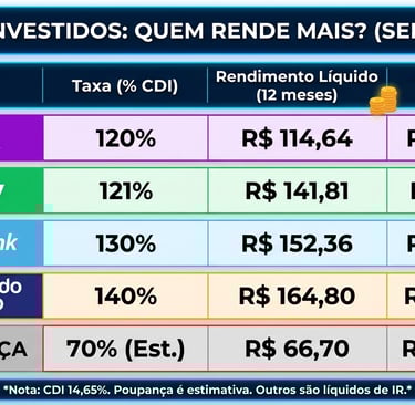 Aviso de Segurança: A Poupança ficou em último lugar isolado. Se você ainda deixa dinheiro lá, está perdendo poder de compra. Enquanto os bancos digitais entregam lucros acima de R$ 140, a poupança mal passou dos R$ 66 no período. Fuja dela!